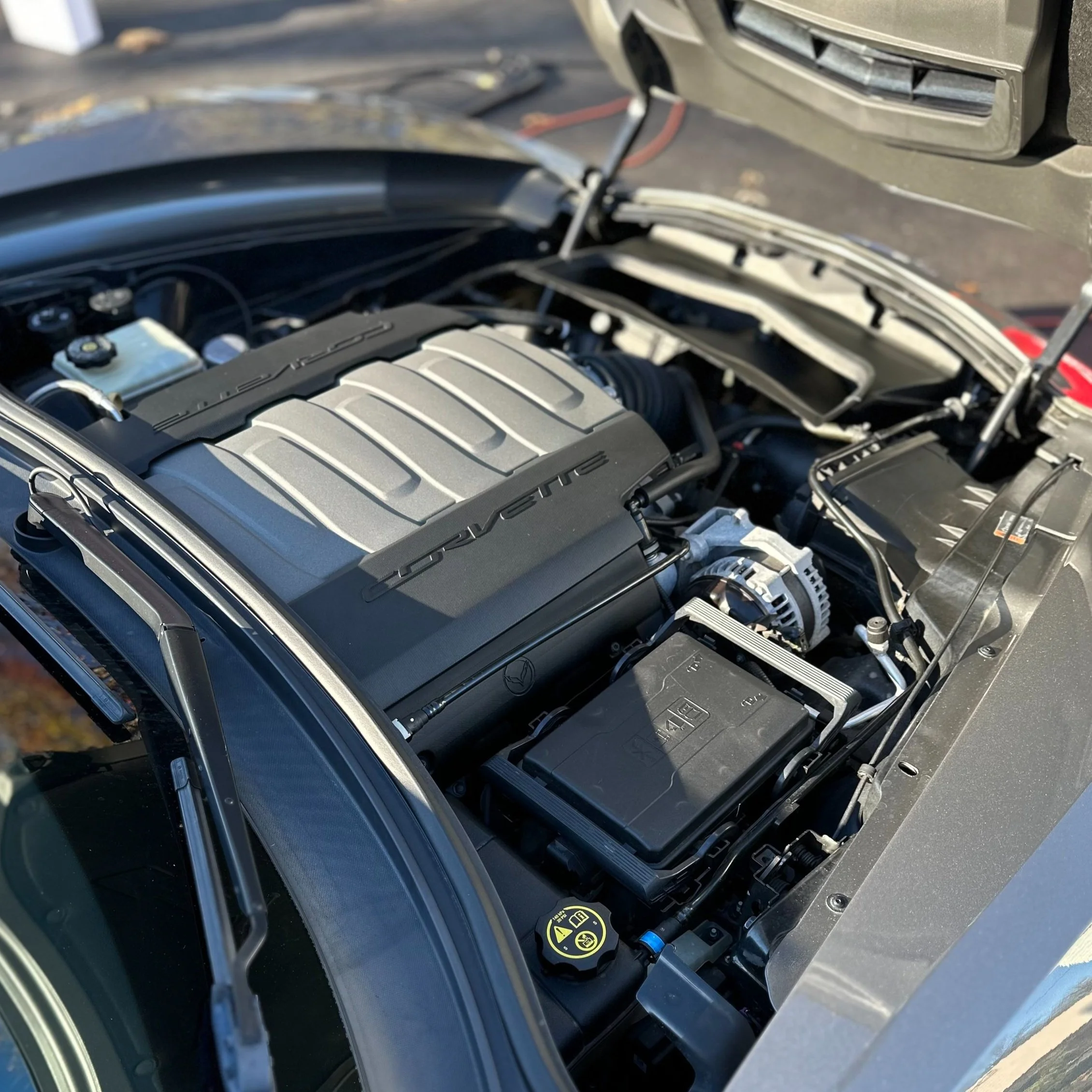 Low pressure wash on the hood and engine bay, maintaining a safe technique around more delicate engine components.